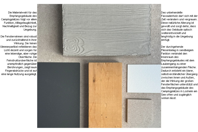 Die beiden nach Süden orientierten Anbauten (Rezeption und Restaurant) bilden zusammen mit dem Empfangseingang die Hauptansicht des Empfangsgebäudes und sollen den Campingplatz repräsentieren.